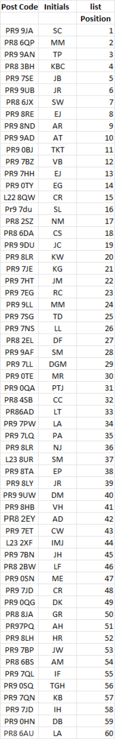 Our current waiting list is below, identified by post code and initials only.